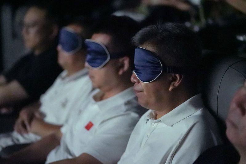 ▲ 参会代表借助眼罩观看无障碍电影《我的父亲焦裕禄》