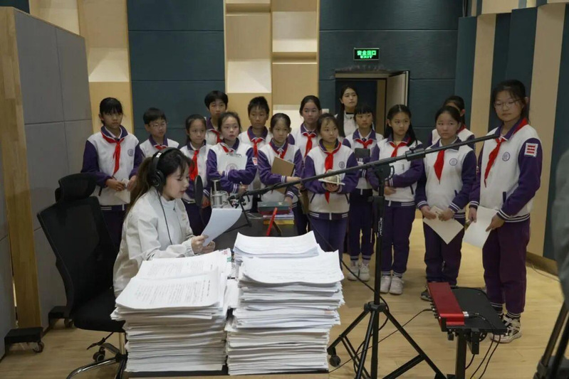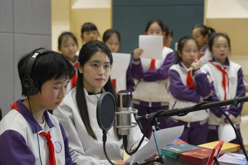 ▲同学们在“光明影院”员工志愿者的带领下体验配音环节